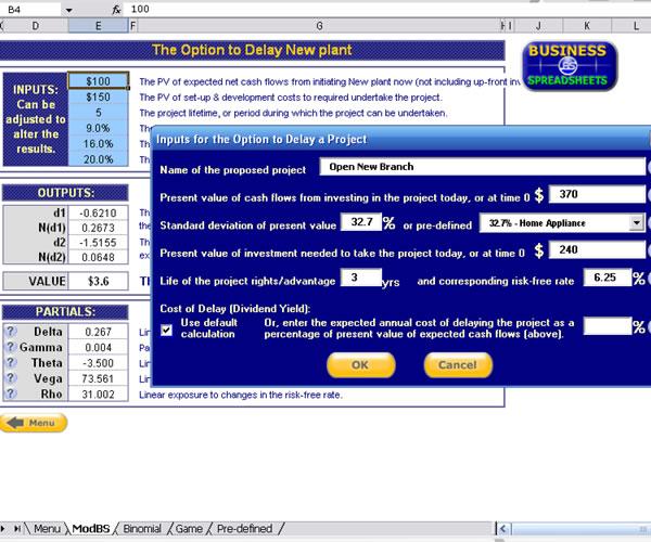 The Real Option Valuation model encompasses a suite of option pricing tools to quantify the embedded strategic value for a range of financial analysis and investment scenarios. Traditional discounted cash flow investment analysis will only accept an investment if the returns on the project exceed the hurdle rate. While this is a worthwhile exercise, it fails to consider the myriad of strategic options that are associated with many investments. This model provides the ability to identify what options might exist in your proposal and the tools to estimate the quantification of them. The key features of this model include: Ease and flexibility of input, with embedded help prompts; Informative 'Quick Start' menu for choosing the correct tool for the situation; Modified Black Scholes models to value the options to delay, expand, or abandon investments; Automatic binomial 'tree' builder model to evaluate complex strategic options with multiple stages; Nash equilibrium Game Theory model to evaluate market entry strategies in a competitive environment; and Ability to predefine historical investment and/or industry risk profiles to utilize across models. |
